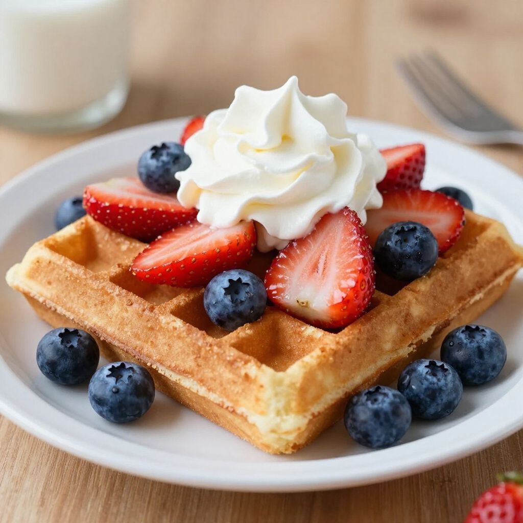 (Red waffle slice topped with whipped cream and fresh strawberries) A summertime favorite! Sweet, ripe strawberries layered over a golden waffle with a swirl of whipped cream.