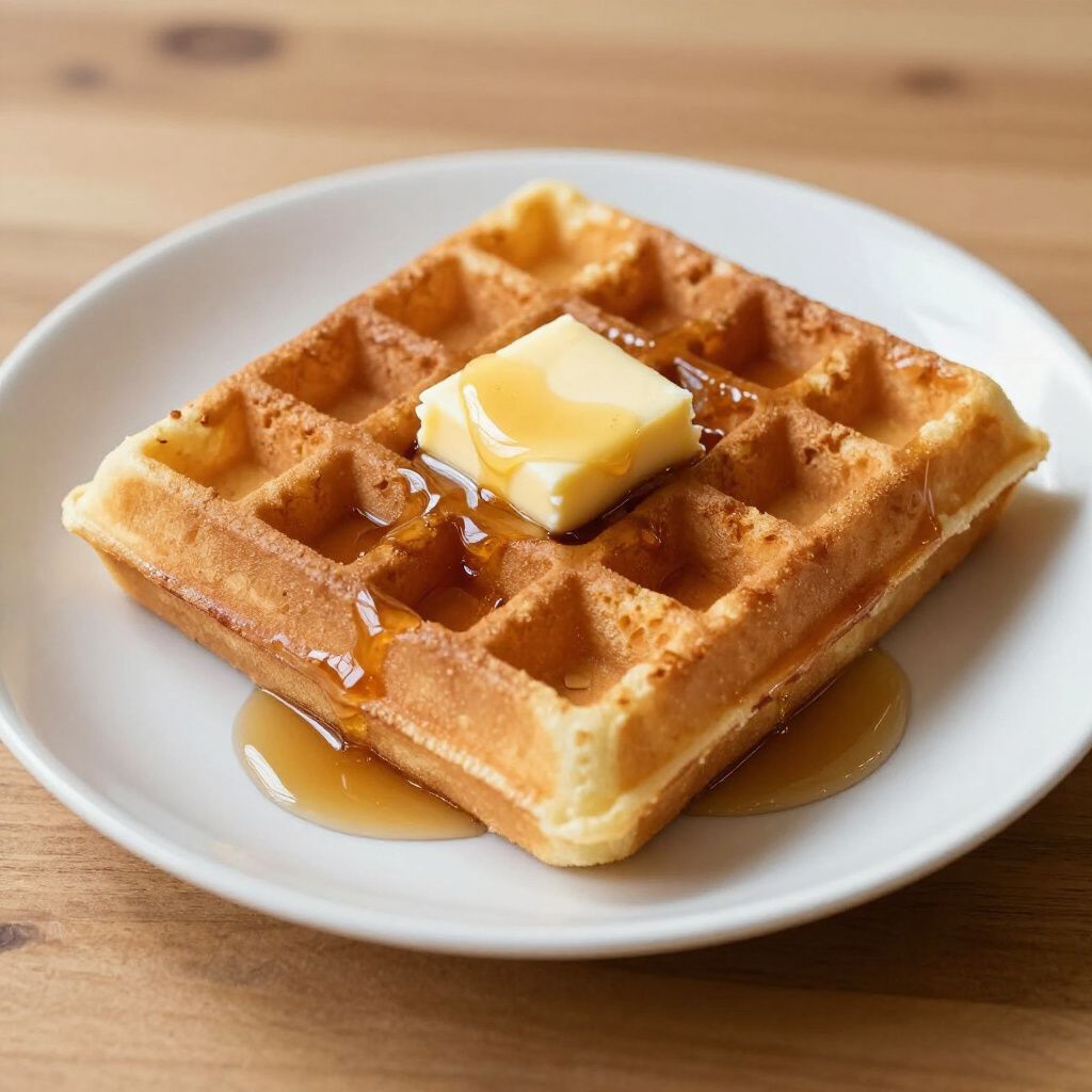 (Golden waffle with melting butter and syrup drizzle) Classic southern-style waffle — crispy on the outside, fluffy on the inside, and pure comfort with every bite.
